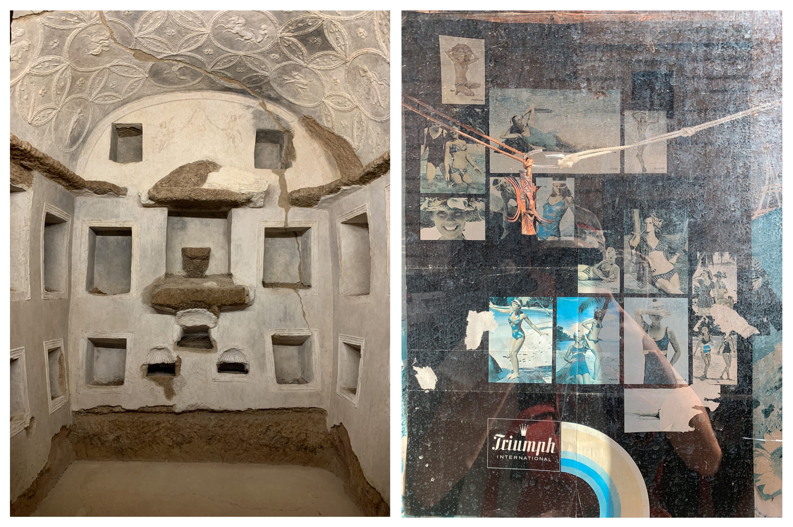 There is something entombed about these images, their colours washed out after years of encasement behind glass. In my imagination, the odd little display forms a conversation with the shelves and alcoves of a Roman columbarium, such as those in the Museo di Roma at the Baths of Diocletian.