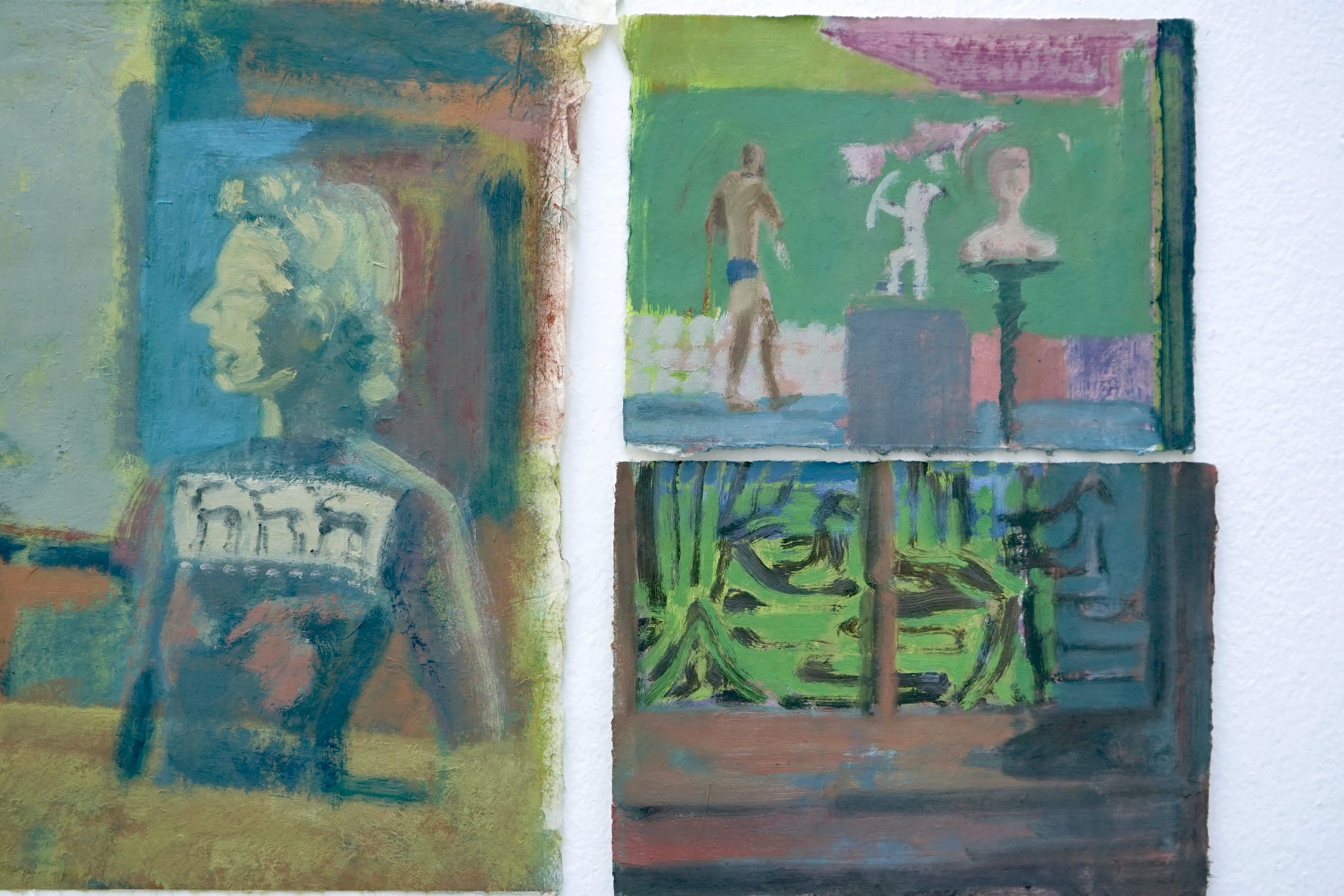 Whilst some of the images have seemed to create for themselves a more or less coherent scenario, others exist freely floating in a more abstract space. In handling the images themselves, I have enjoyed pushing their qualities and forms, stretching them through the materiality of the paint.