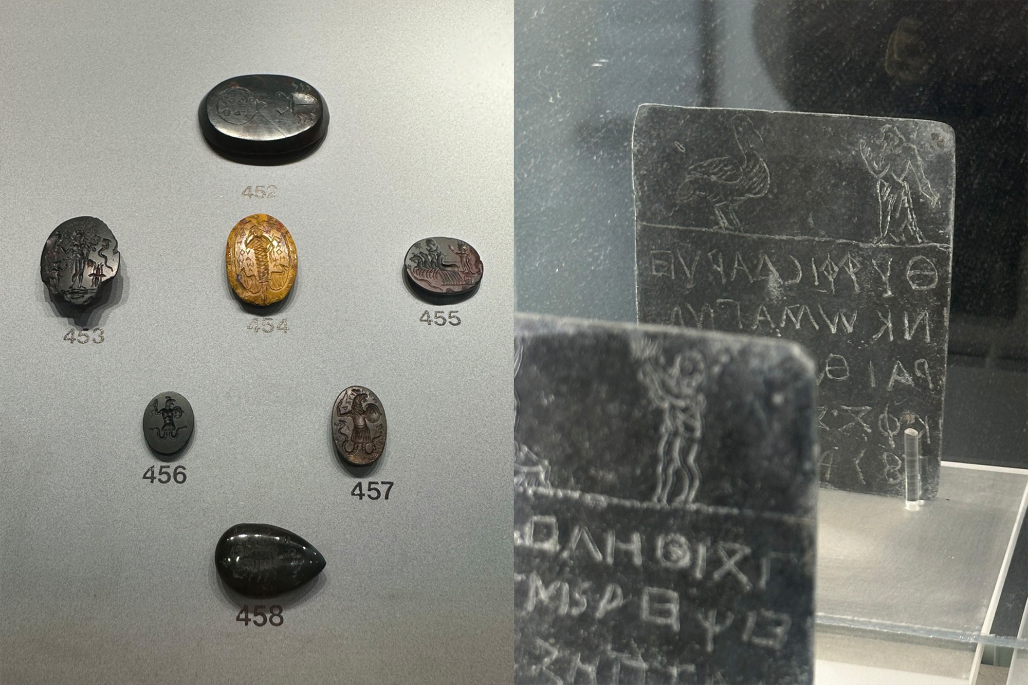 In Naples, I also loved seeing the Farnese gemstones at the Archaeological Museum, which include a large number of apotropaic amulets. It was here that I came across the Gnostic figure Abraxas: a deity depicted with a rooster’s head, a warrior’s body, and two serpents as legs—believed to surpass dualisms and binaries such as good and evil, light and dark etc. I later learned that he was often invoked on many of the defixiones I had seen in Rome.