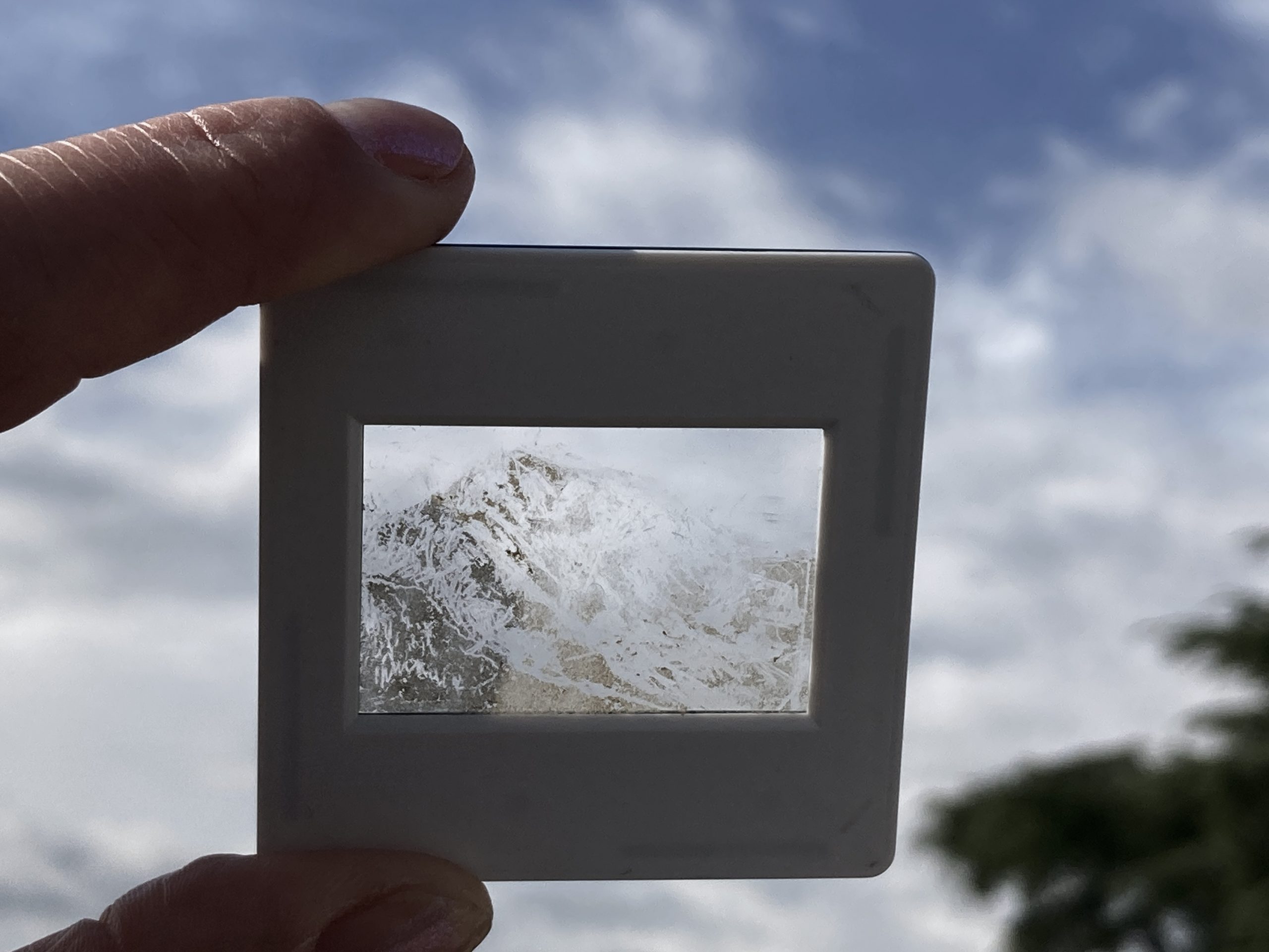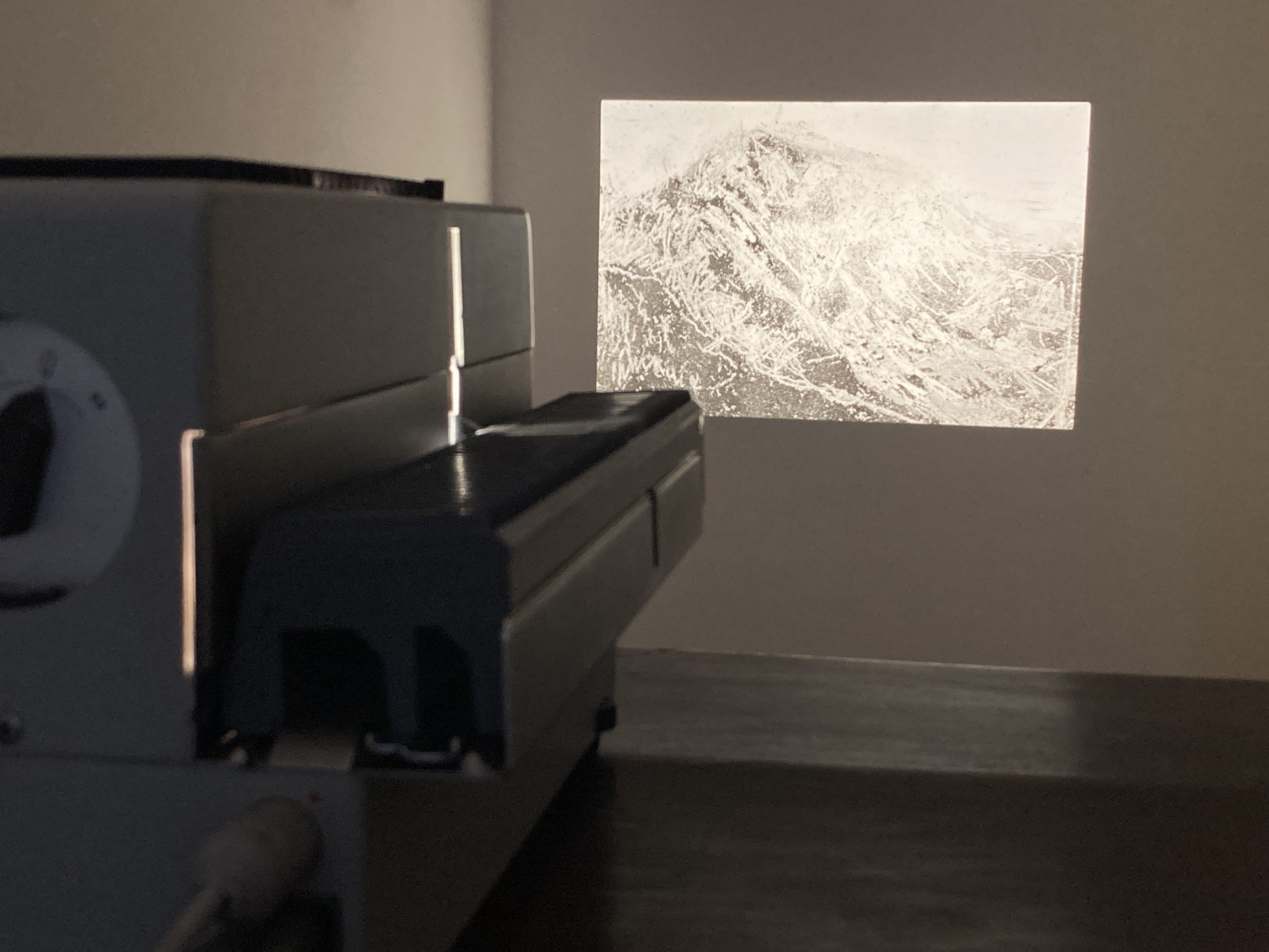 I’ve been collecting sediments, using these to draw, both on paper and as tiny negative space drawings on transparency. I’ve been playing with making these 2x3cm transparencies as 35mm slides to be viewed in an old projector. Their diminutive form seems to resist associations of mountains with timeless grandeur. When projected, the material drawing itself is obscured, instead seen through its monstrous shadow that enlarges my delicate hair- breath marks, and the raw rough, awkwardness of my human errors.